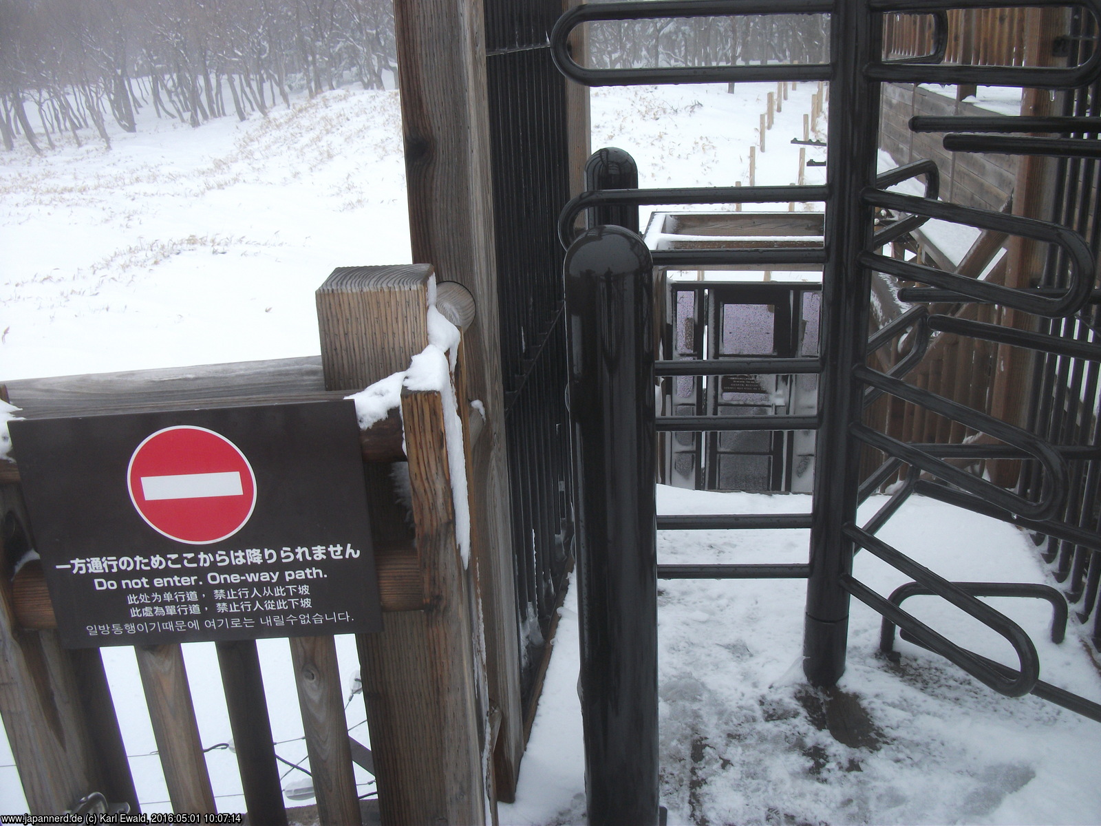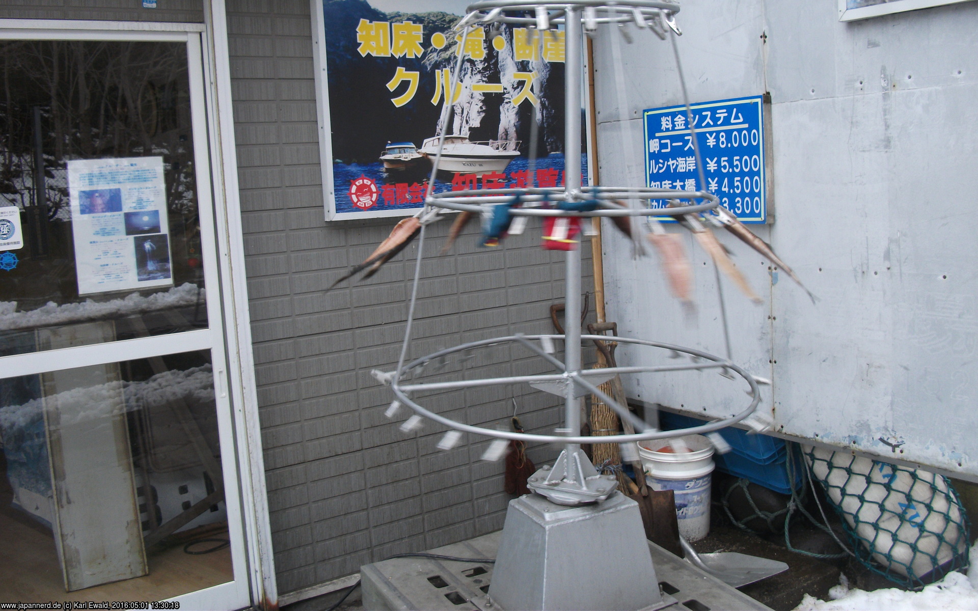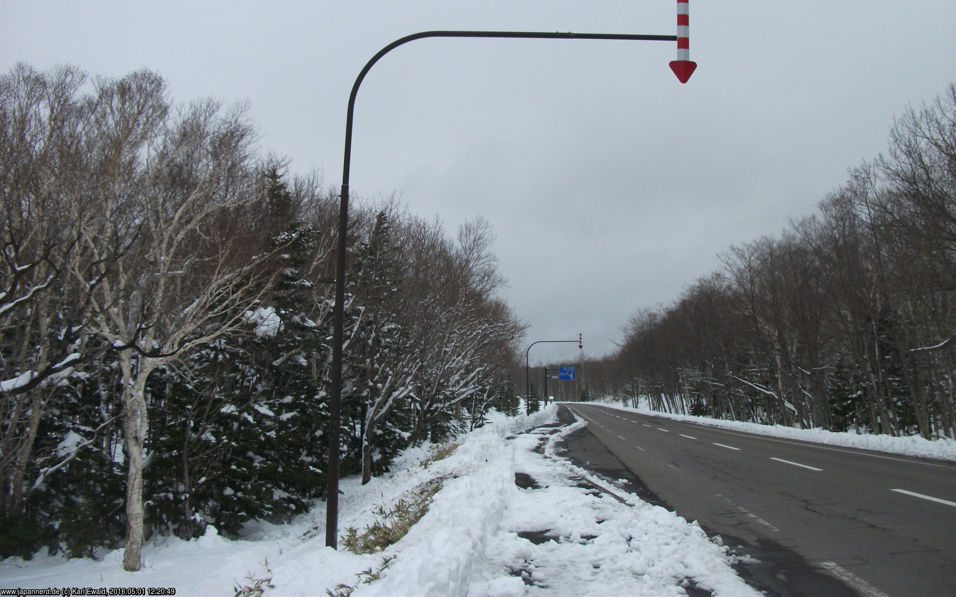 Überall auf Hokkaido finden sich solche Pfeile, die von oben auf den Straßenrand zeigen. An der linken Seite sind sie rot-weiß gestreift, an der rechten Seite weiß mit gelber Spitze. Ich vermute, sie dienen dem Schneepflug oder anderen Fahrzeugen zur Orientierung, wenn die Fahrbahn zugeschneit ist.