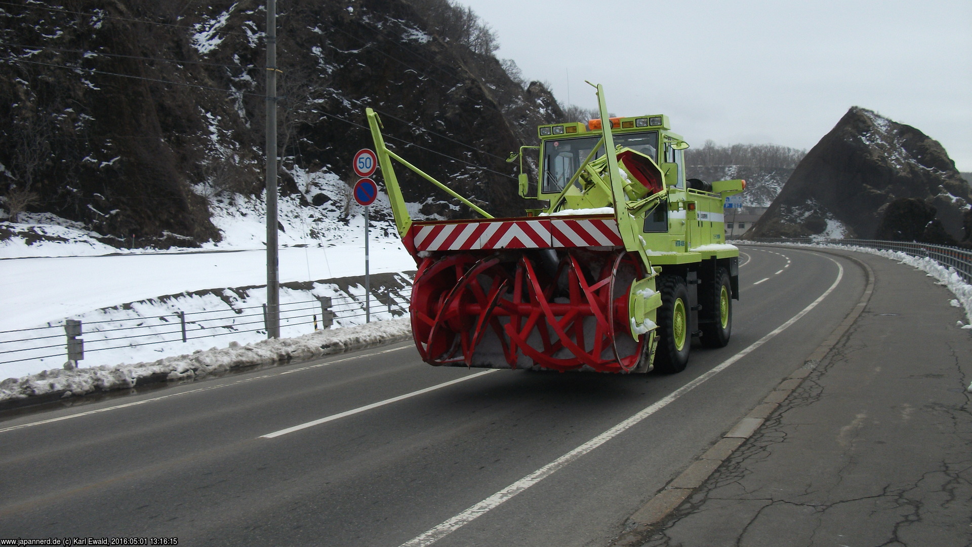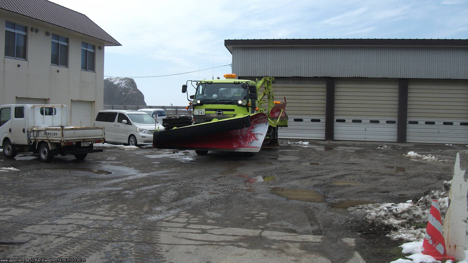Shiretoko, bei Utoro: Schneepflug bei der Ausfahrt aus der Straßenmeisterei