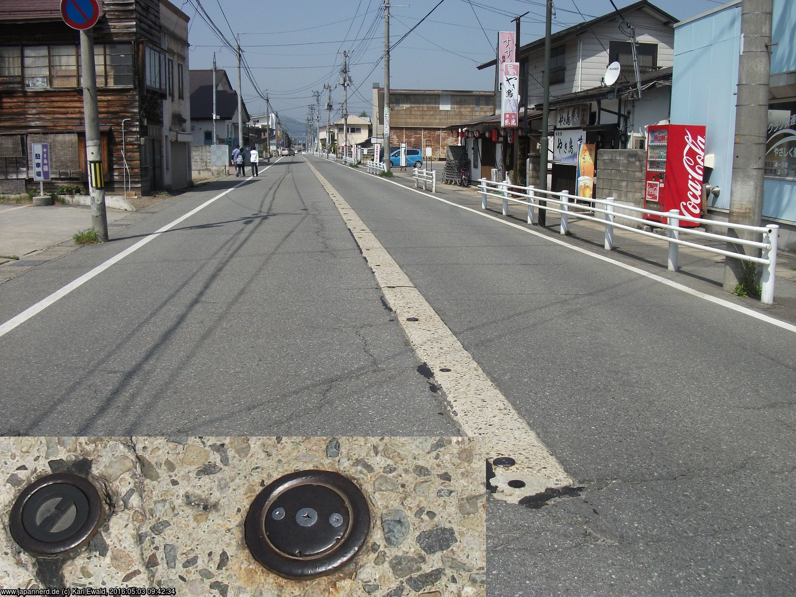 Yonezawa: über solche Düsen entlang der Straßenmitte wird im Winter der Schnee mit Wasser weggespült