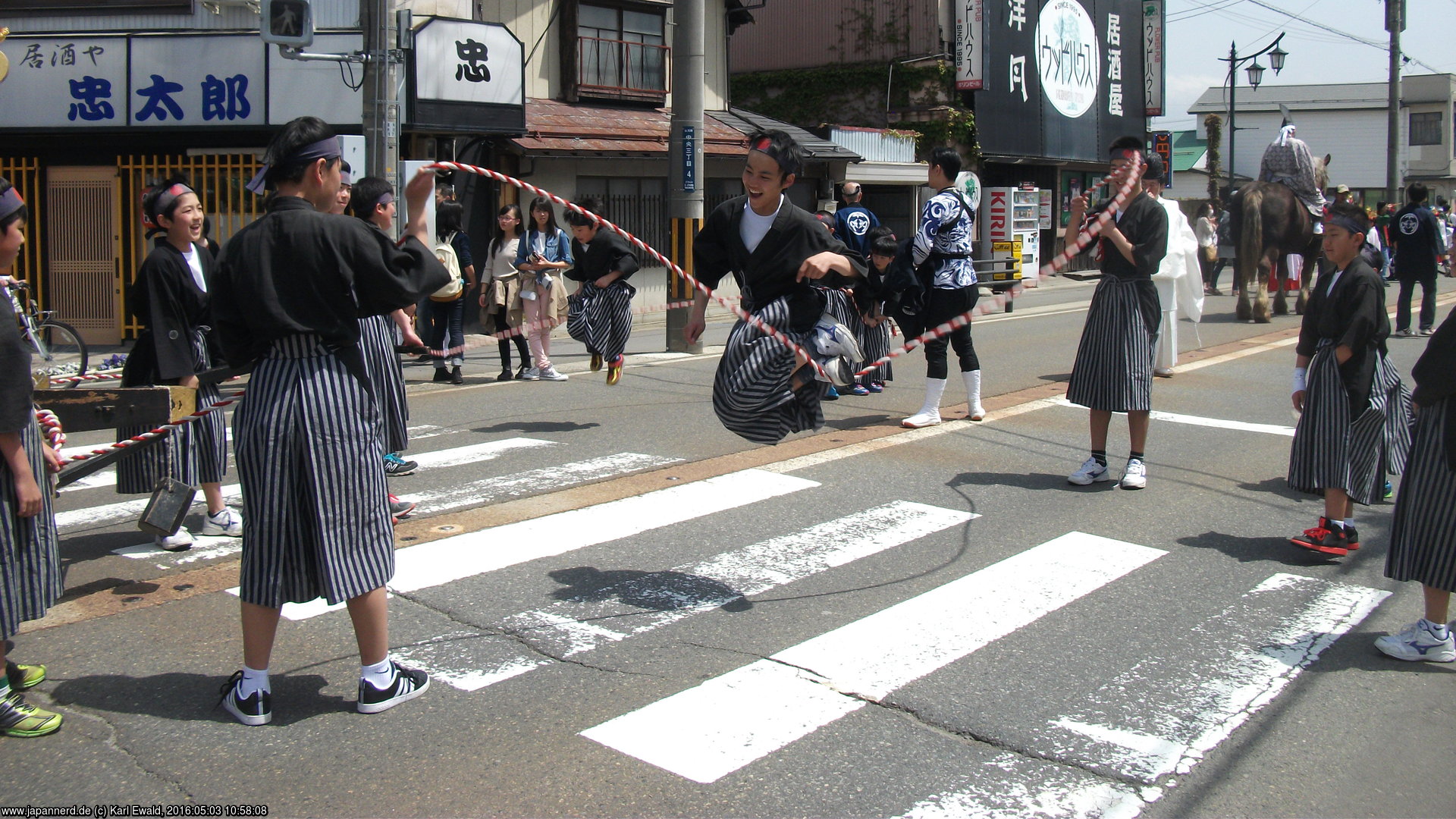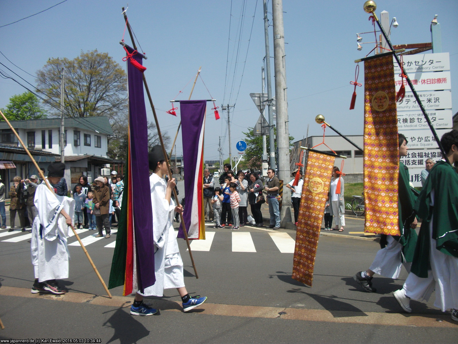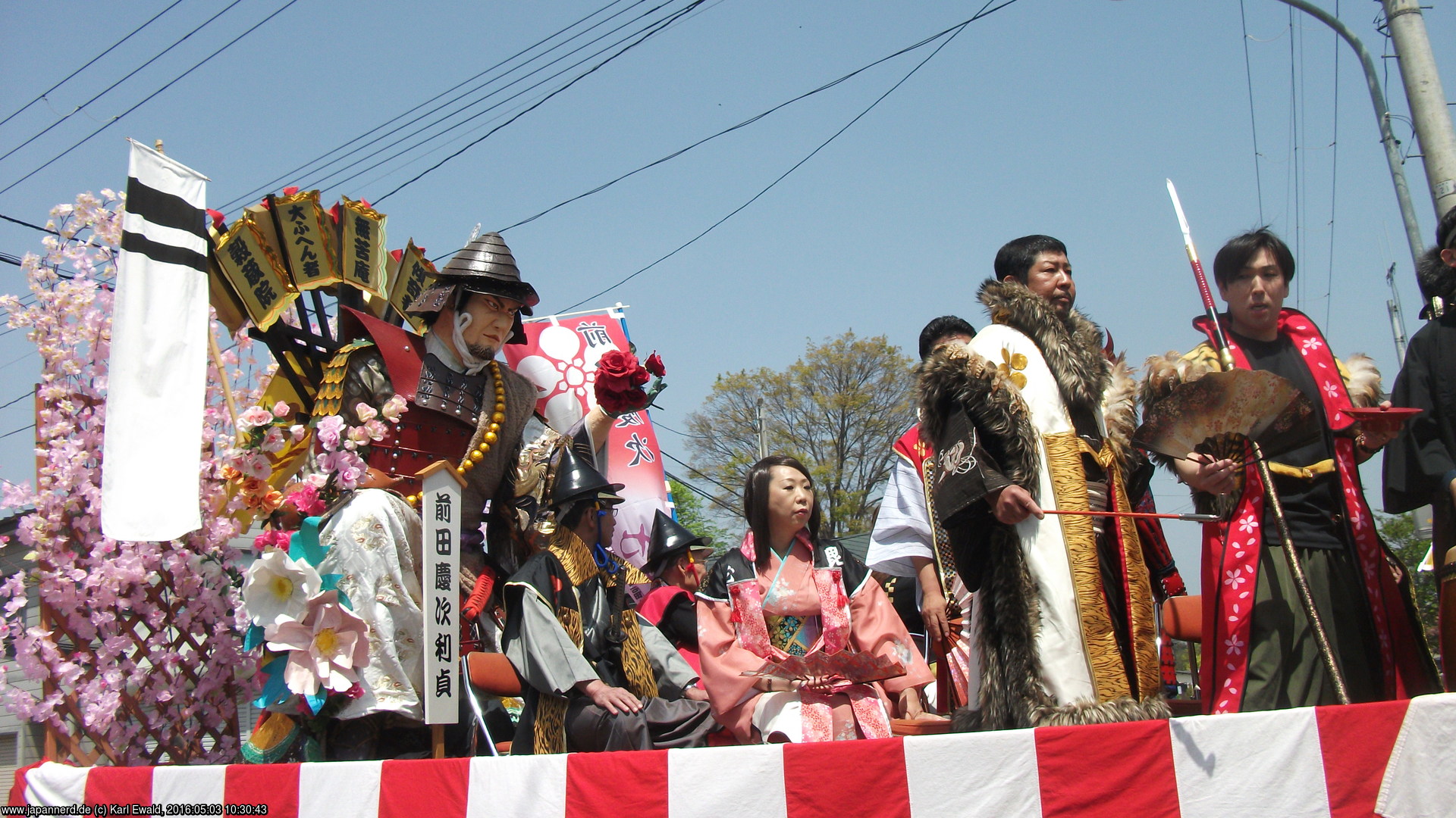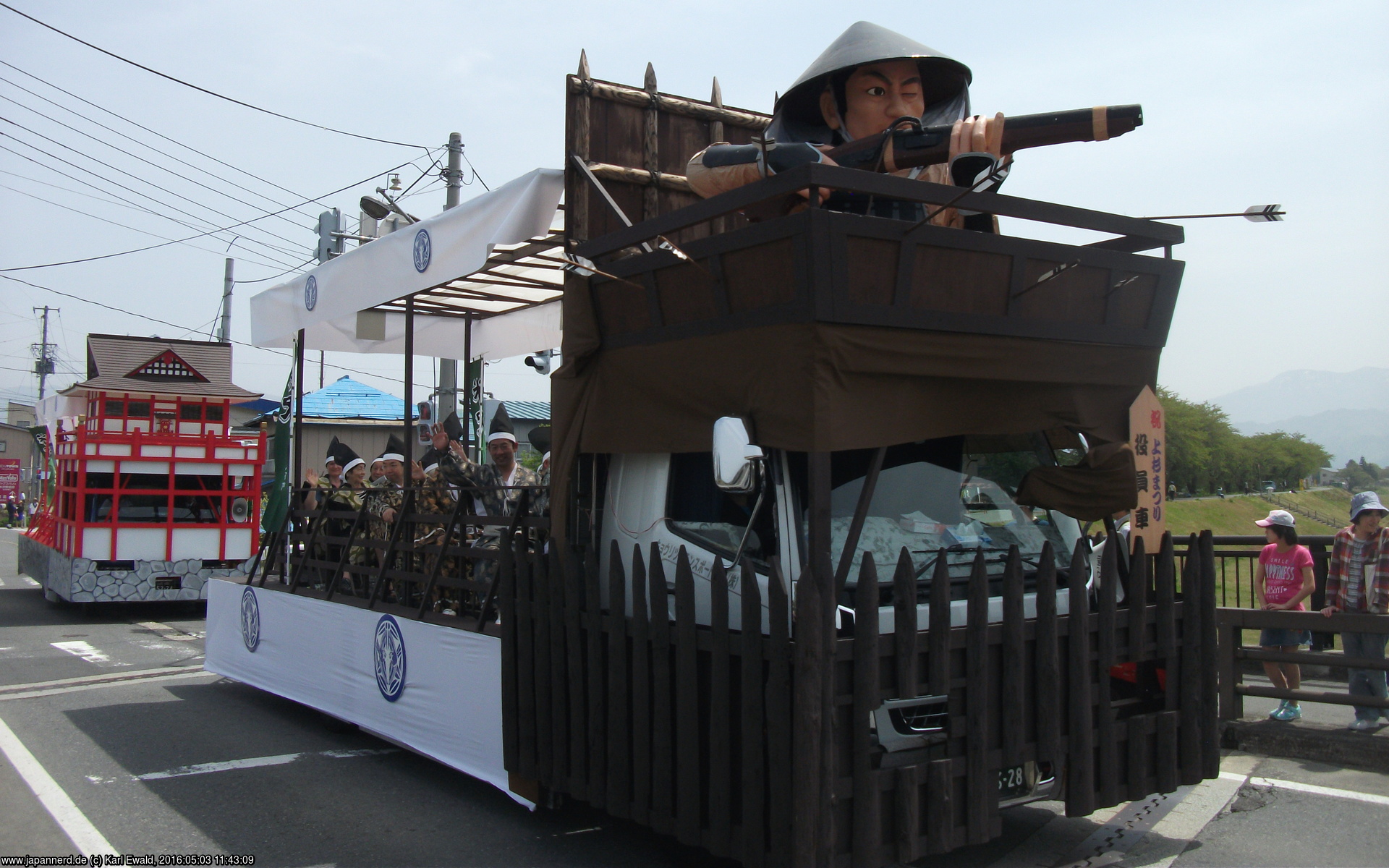 Die Schlachtdarstellung bildet den Höhepunkt und Abschluss des Yonezawa Uesugi Matsuri, das jährlich vom 29.4.-3.5. abgehalten wird. Landesweit findet in der Golden Week unzählige Matsuri statt, von denen viele ihren Höhepunkt auf den 3.5. legen – für Matsuri-Touristen wie mich eher ärgerlich, weil ich mich am liebsten vierteilen würde, aber verständlich, denn dieser Feiertag der Golden Week bietet möglichst vielen Zuschauern die Gelegenheit, das Spektakel mitzuerleben.