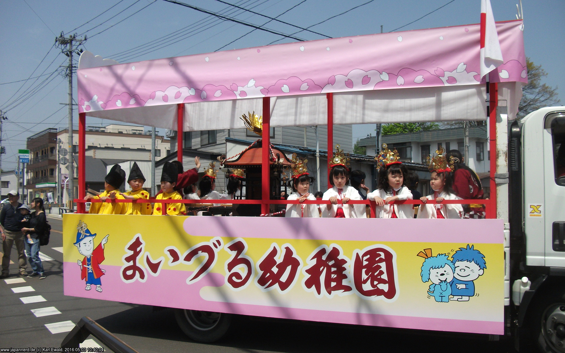 Yonezawa, Uesugi Matsuri: ein Wagen mit Kindern und einem kleinen Mikoshi