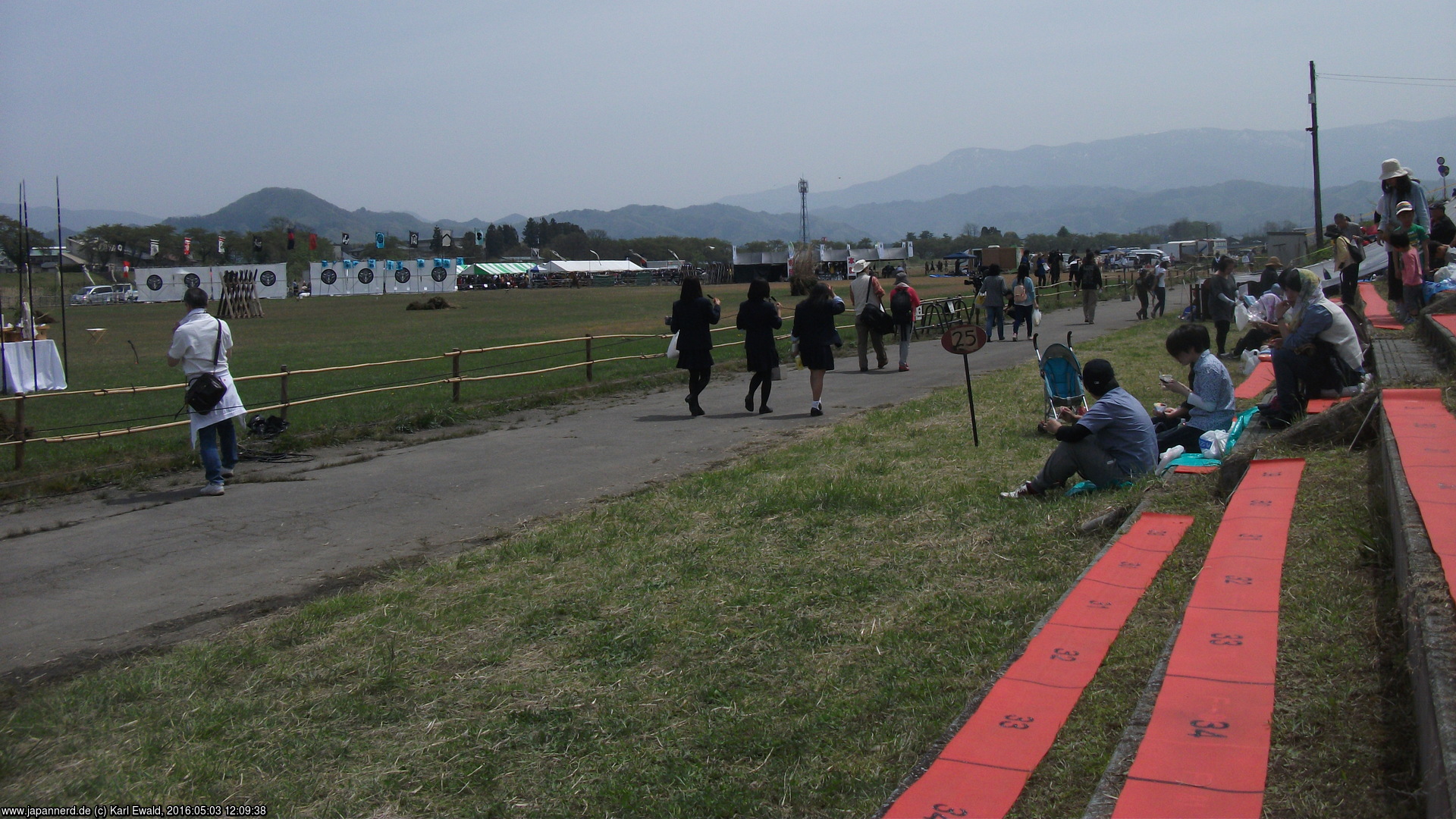 Die Schlacht soll um 14 Uhr beginnen. Vor dem Schlachtfeld befindet sich eine Tribüne aus Treppenstufen. Ihr Mittelteil mit der besten Sicht aufs Geschehen ist mit Nummernreihen ausgelegt, man kann dafür Platzkarten für 2000 Yen kaufen. Seitlich davon befinden sich kostenlose Plätze.
