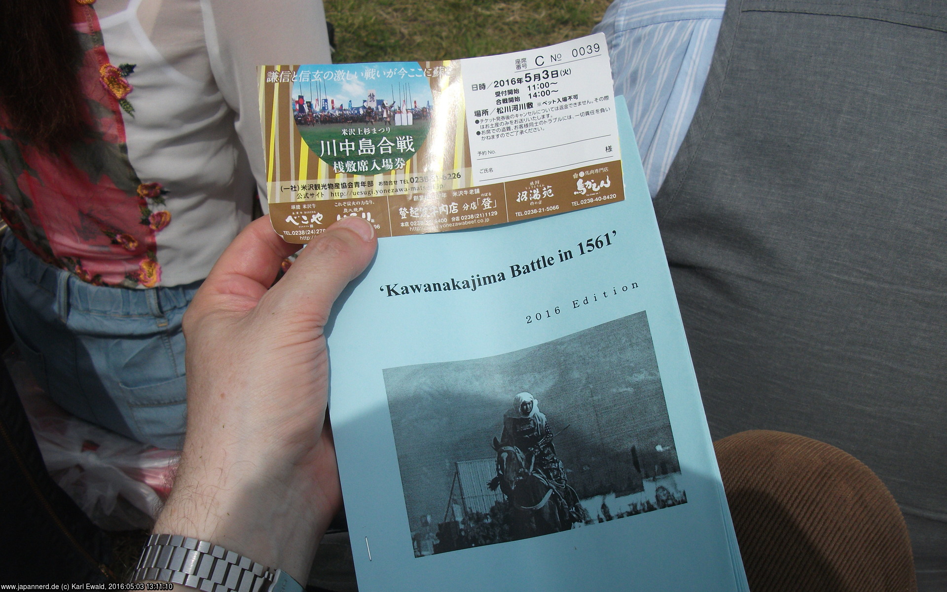 Yonezawa, Uesugi Matsuri: Die Platzkarte umfasst (für mich auf englisch) auch ein Skript für das dargestellte Geschehen, eine Flasche Wasser, ein Kissen und ein Tuch.