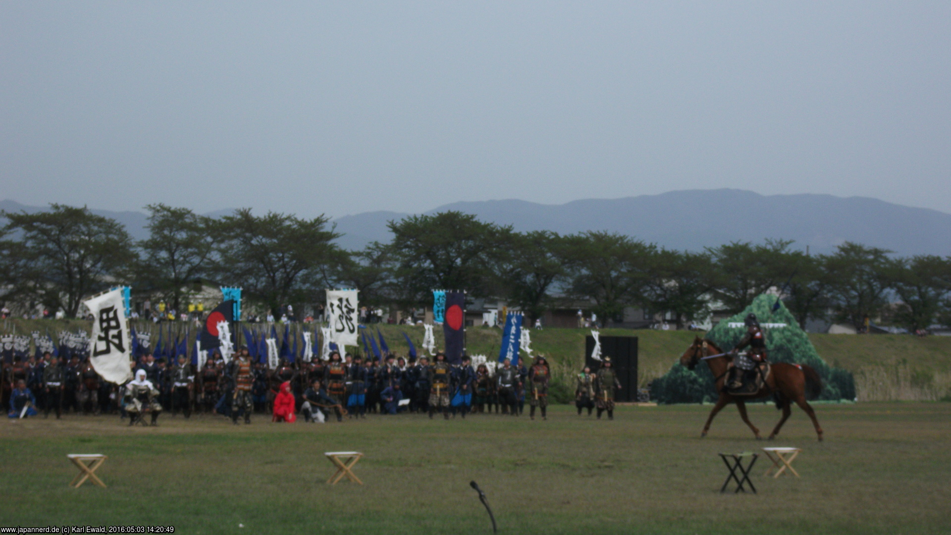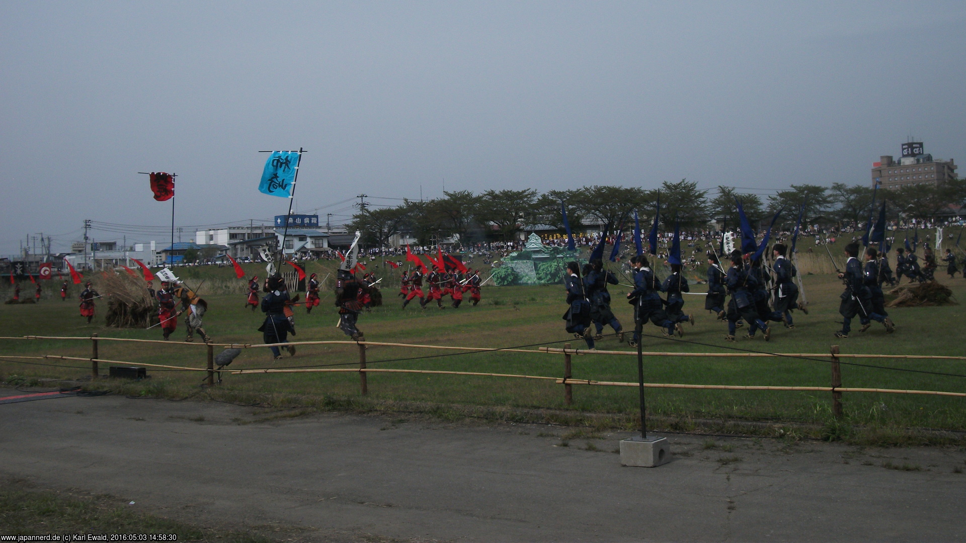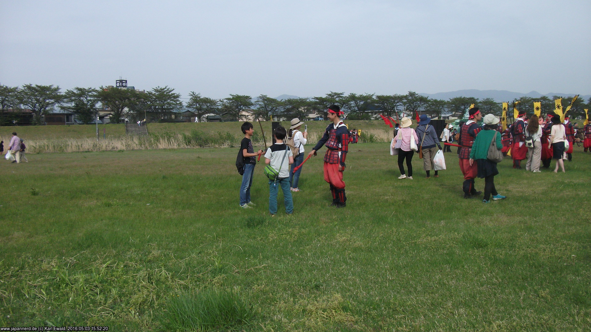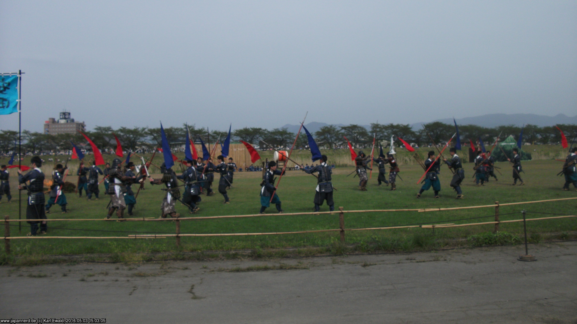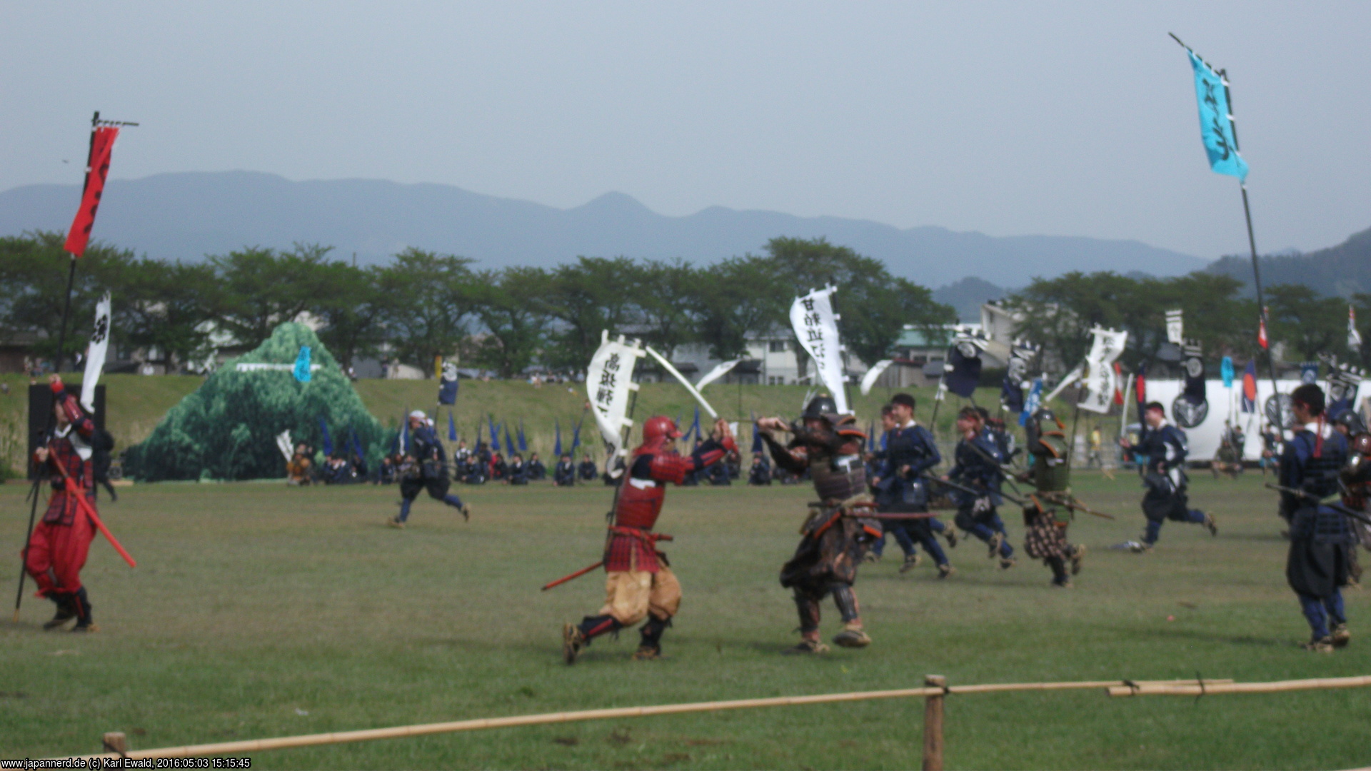 Die Mammutfahrt hatte ein konkretes Ziel: die Schlacht von Kawanakajima 1561, in der 2016 Auflage umgesetzt in Yonezawa auf der Wiese Kawanakajima am Fluss.