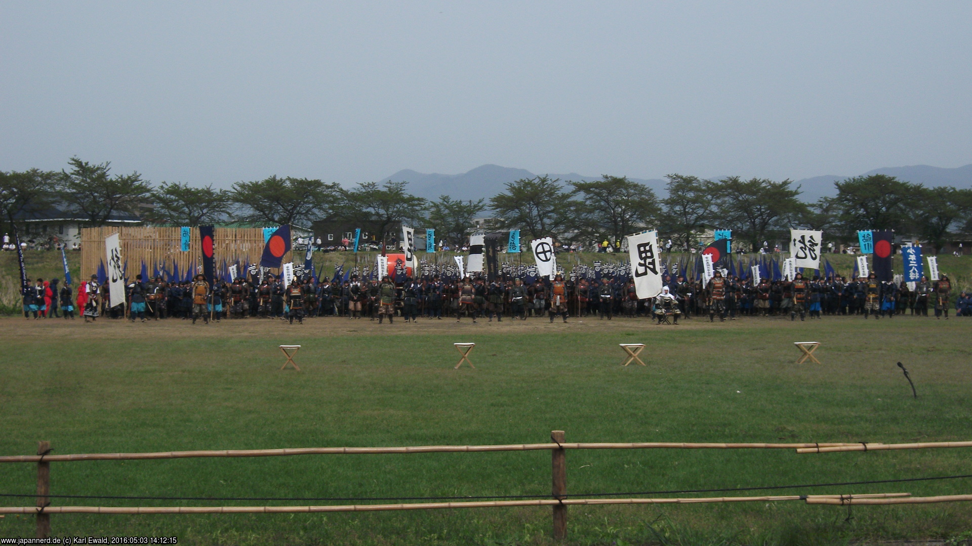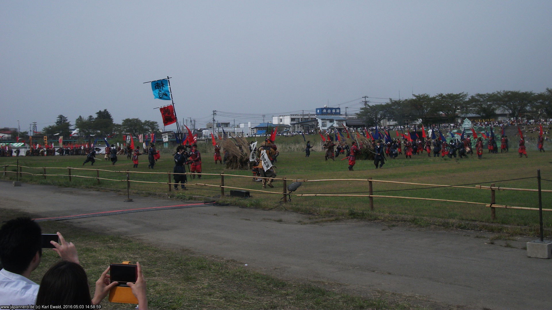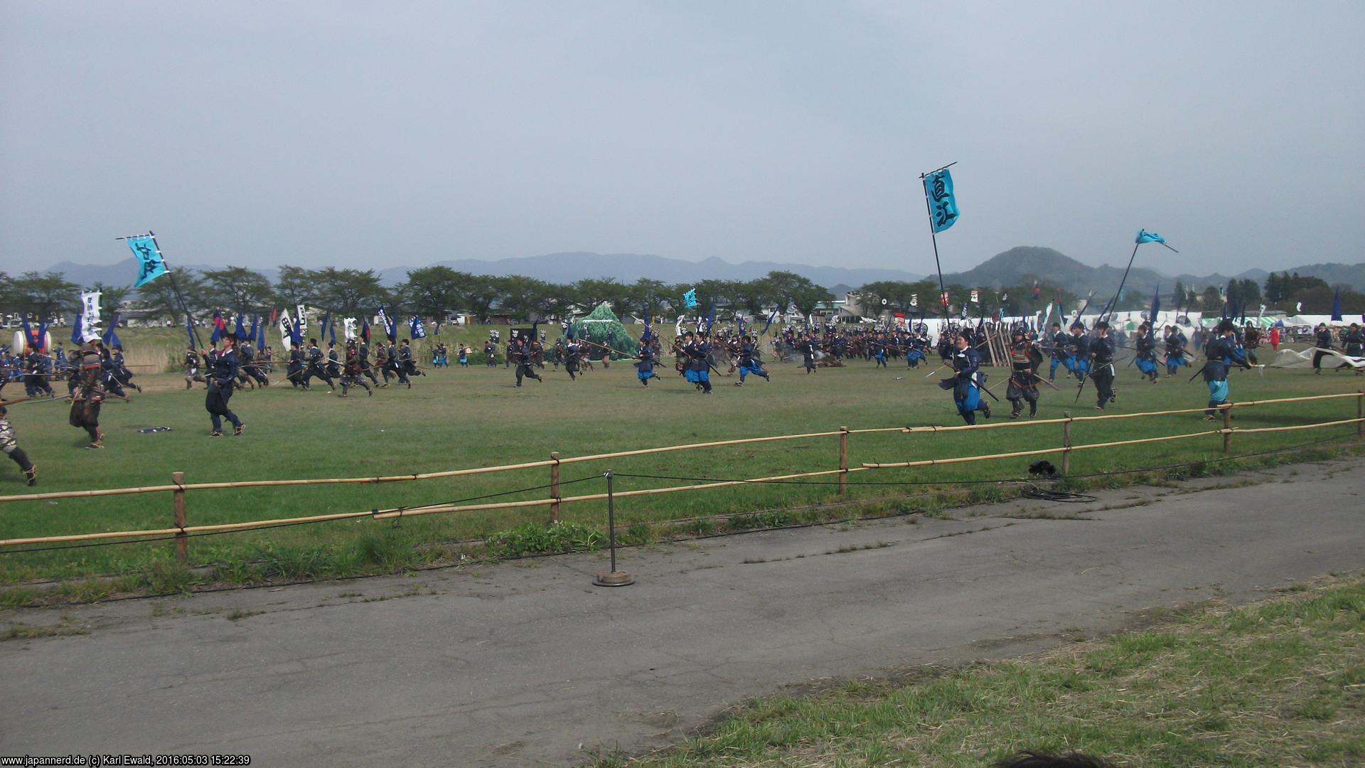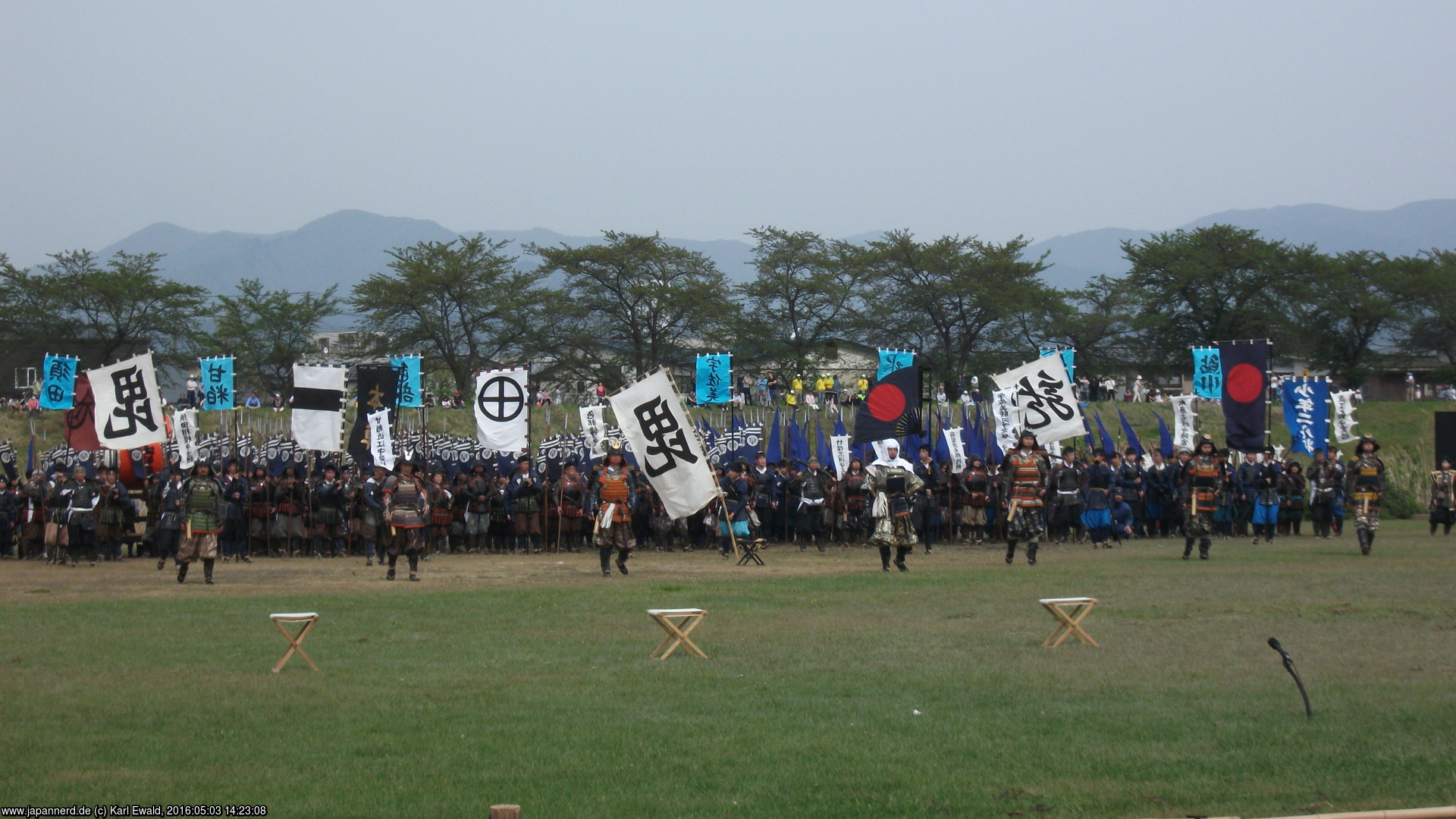 Die Mammutfahrt hatte ein konkretes Ziel: die Schlacht von Kawanakajima 1561, in der 2016 Auflage umgesetzt in Yonezawa auf der Wiese Kawanakajima am Fluss.