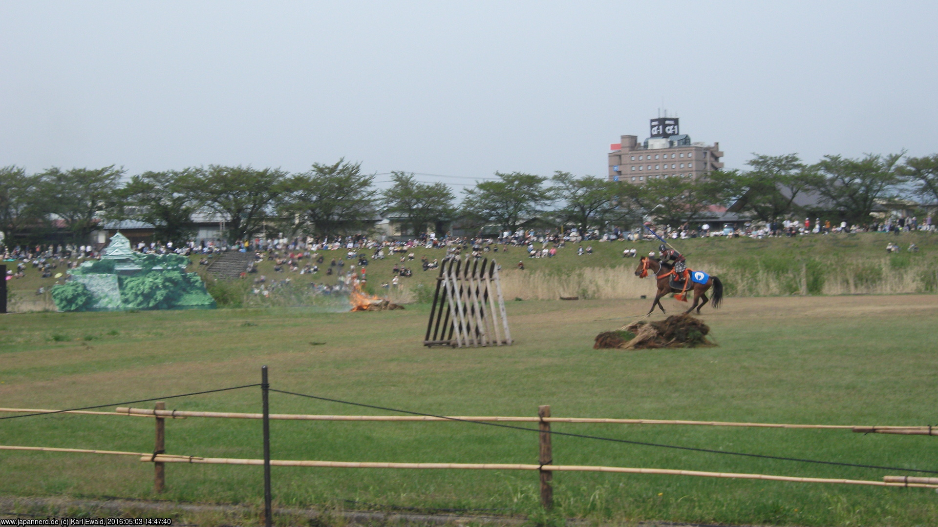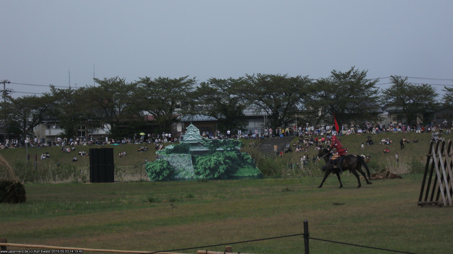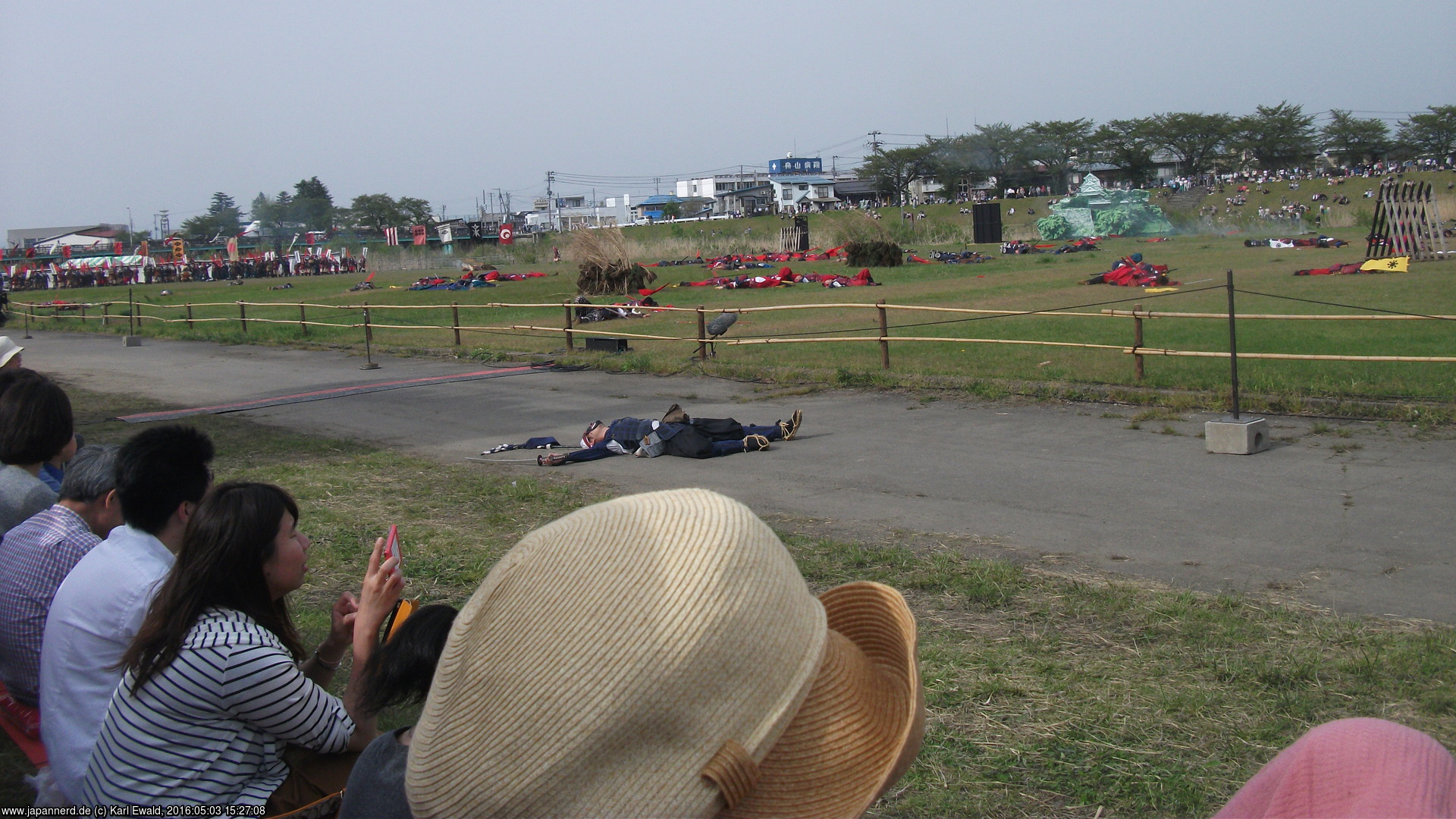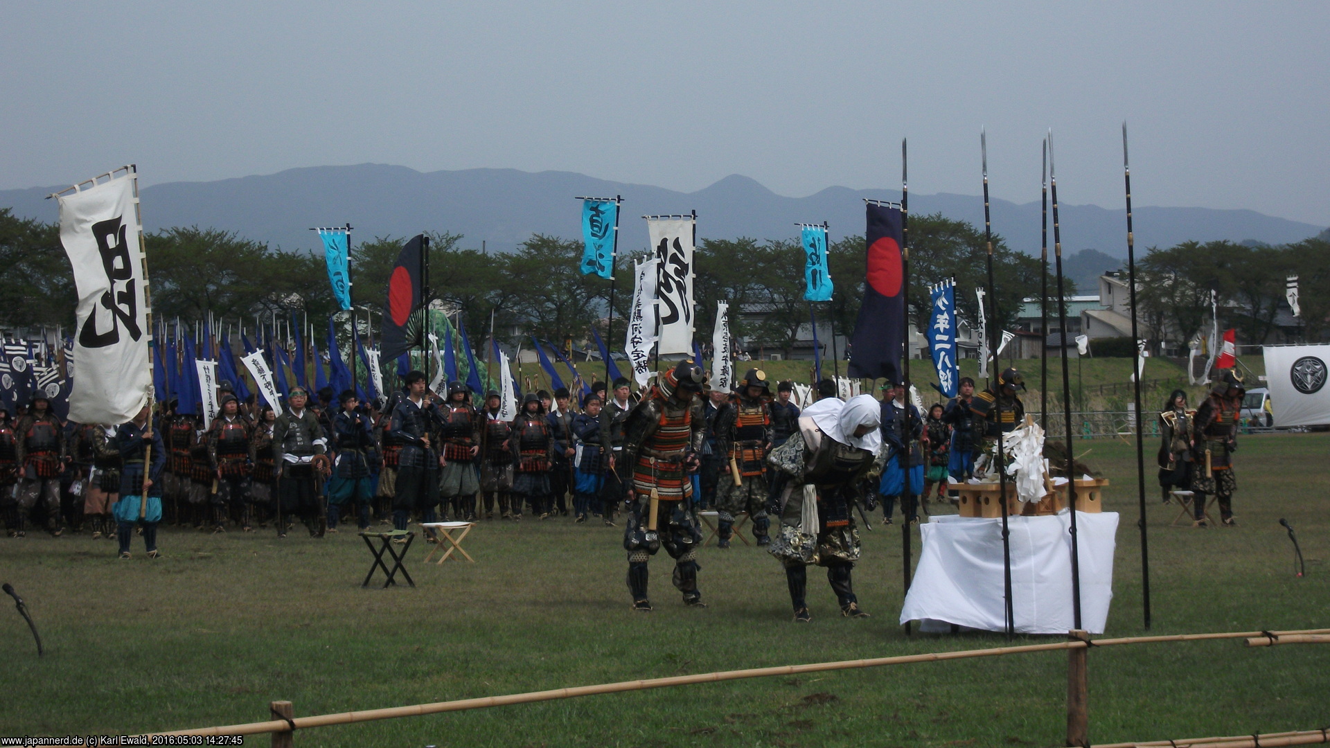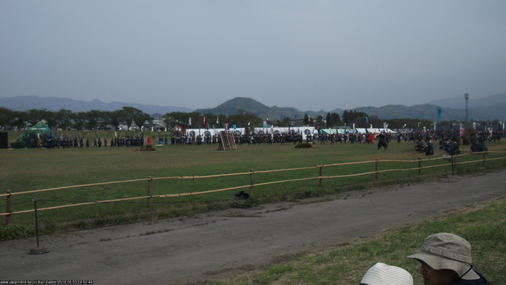 Die Mammutfahrt hatte ein konkretes Ziel: die Schlacht von Kawanakajima 1561, in der 2016 Auflage umgesetzt in Yonezawa auf der Wiese Kawanakajima am Fluss.