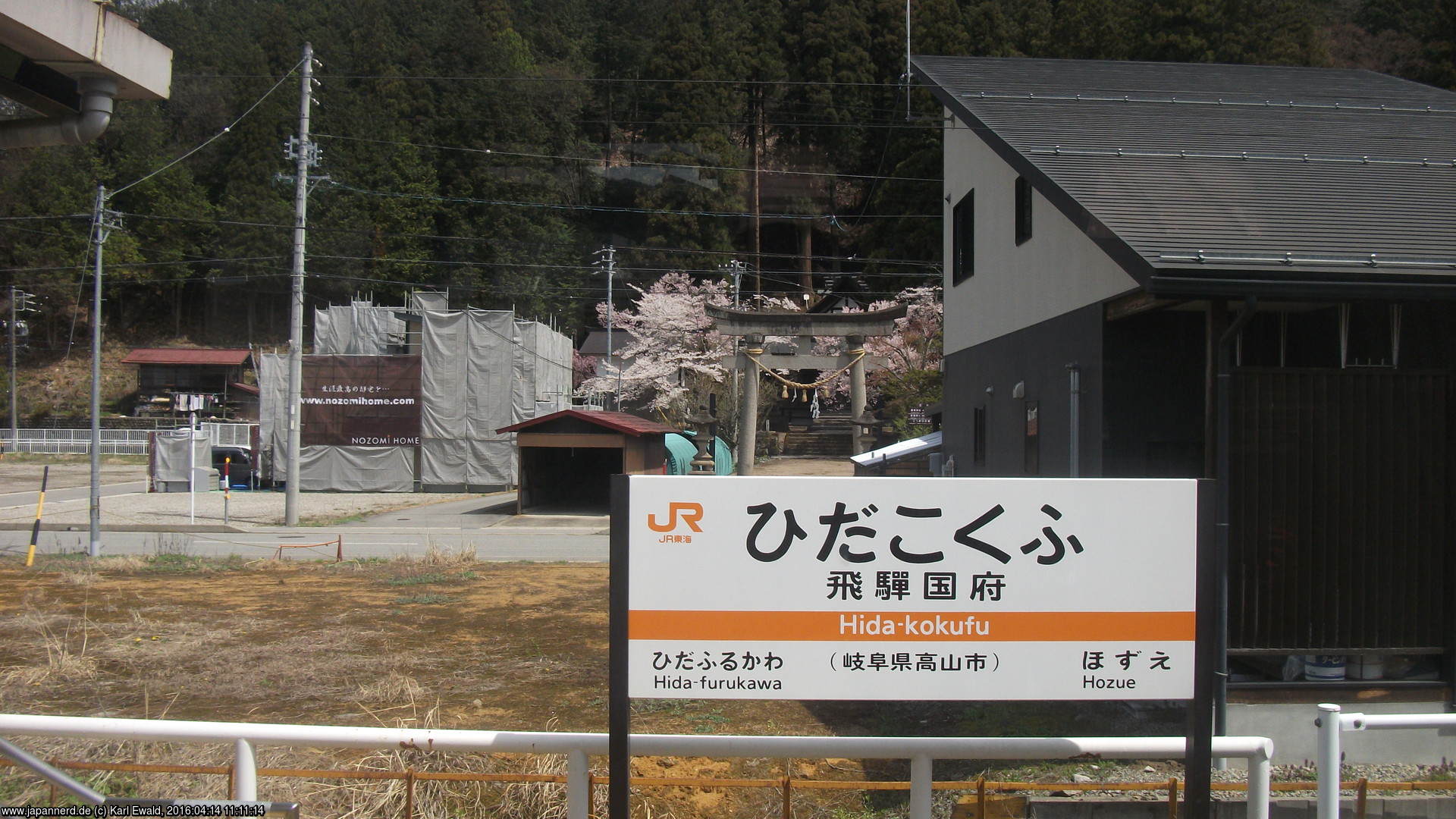 Ich fuhr von meinem Übernachtungsort Toyama mit dem Limited Express “Wide View Hida” in etwa eineinhalb Stunden dorthin. Der Zug hatte nur einen nicht-reservierten Wagen und ich hatte Glück, noch einen Platz zu bekommen, einige Leute mussten stehen. Es ist also ratsam, zu reservieren oder sich geschickt am Bahnsteig aufzustellen und im Wagen lieber denerstbesten Platz zu nehmen, als wählerisch zu sein und am Ende überhaupt keinen mehr zu finden. Auf der eingleisigen Strecke musste der Dieseltriebwagen in Hida-kokufu kurz vor dem Ziel auf den Gegenzug warten. Hier im Gebirge ist die Kirschblüte noch am Höhepunkt.