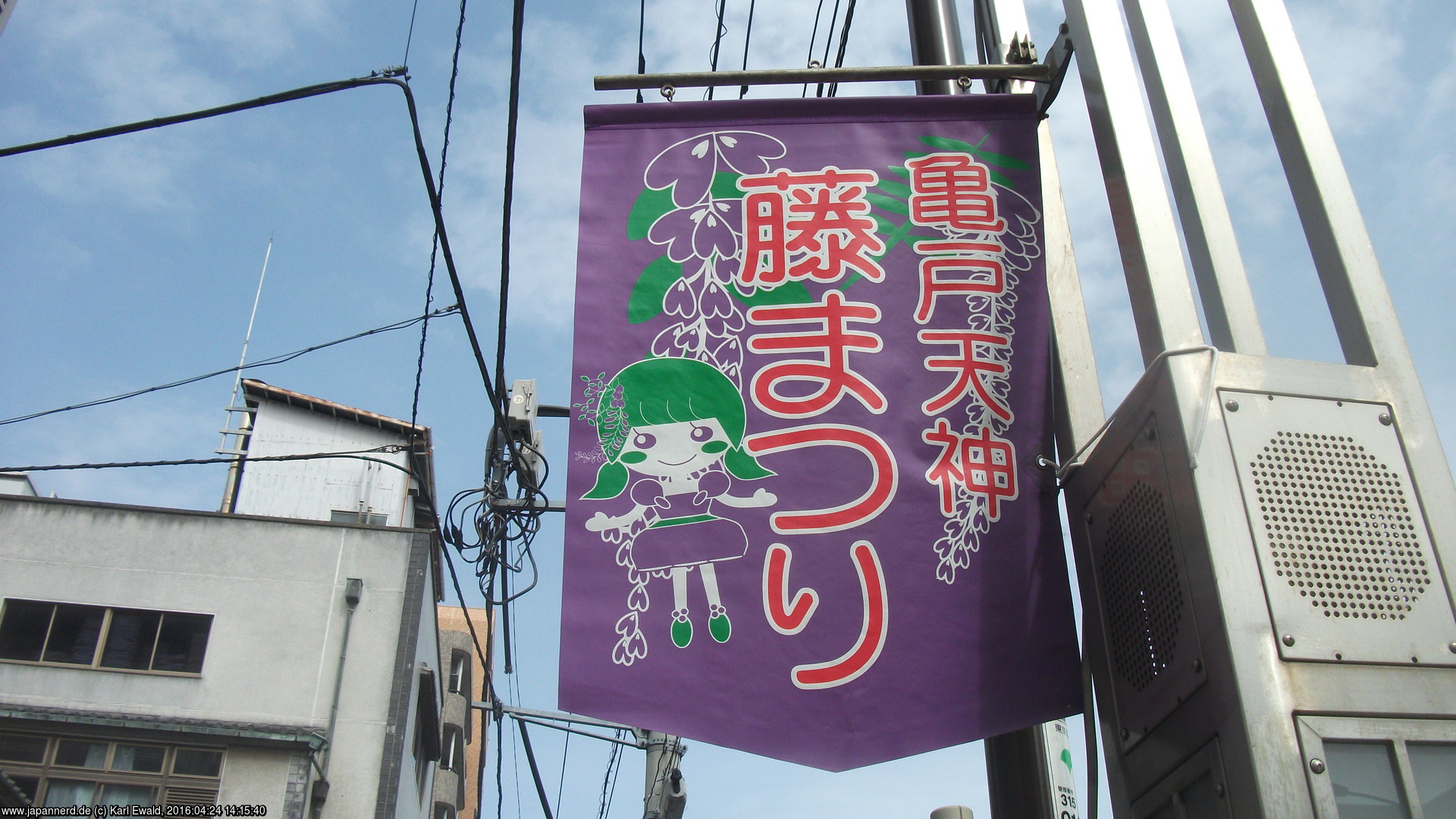 Tokyo, Kameido: Banner für das Wisteria-Matsuri am Kameido-Tenjin-Schrein