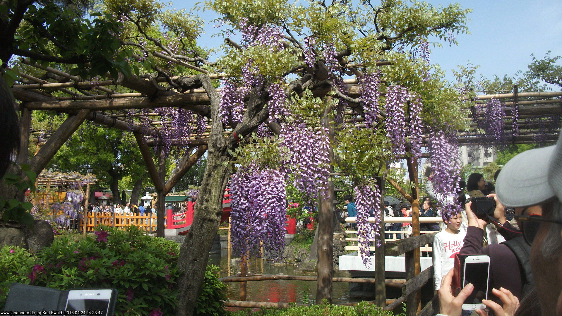 Die Japanische Wisteria oder auch Blauregen, die Japaner nennen sie Fuji, ist eine Liane (Kletterpflanze), die durch ihre langen Blütentrauben ins Auge fällt. Der Kameido-Schrein im Osten Tokyos ist überwiegend mit Wisteria bepflanzt und veranstaltet zur Feier der Blütenpracht jedes Frühjahr ein Matsuri, heuer vom 16.4. bis 5.5.2016. Den Tag vor meiner Abreise aus Tokyo nutzte ich daher noch für einen kurzen Besuch.